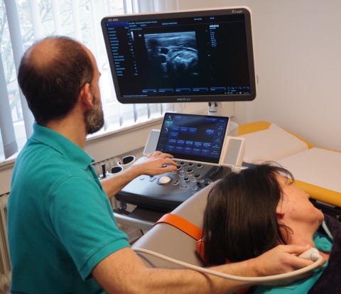 Die sonografische Untersuchung peripherer Nerven und der Muskulatur wird in der neurologischen Diagnostik vermehrt eingesetzt. Sie liefert wertvolle Informationen über die Morphologie von Nerven und Muskeln sowie der sie umgebenden Strukturen und ist somit eine gute Ergänzung zu elektrophysiologischen Untersuchungen. Es handelt sich um ein hochauflösendes, schmerzfreies Verfahren. Unter anderem können Engpasssyndrome wie z.B. das Karpaltunnelsyndrom diagnostiziert werden.